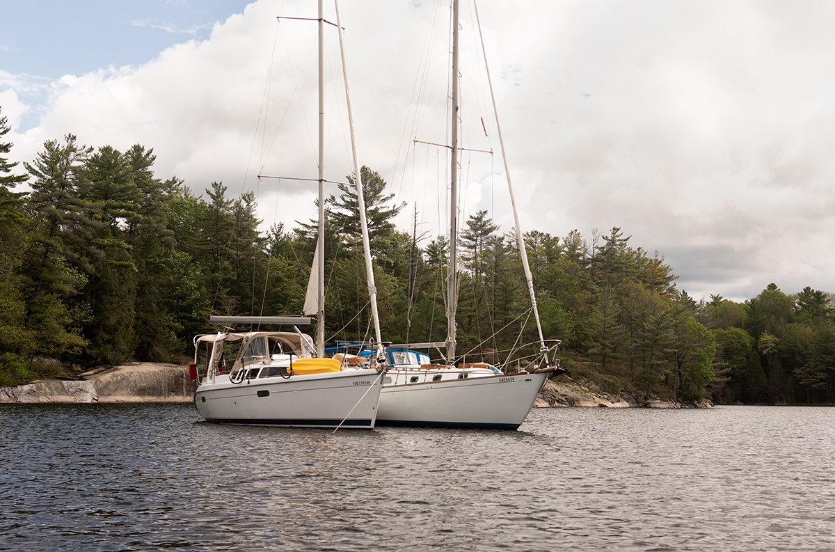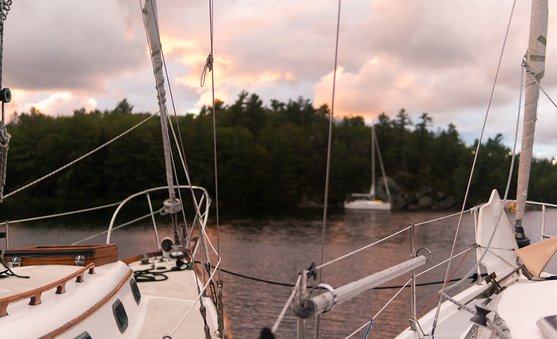 Heading for Frying Pan Bay, we sailed up Beausoleil Island with a nice south west wind that filled the cruising chute making a perfect run up to Big Dog Channel. We arrived at an almost empty Frying Pan Bay just after sunset and dropped the hook in the middle of the bay. We were snarked at by a power-boater when we entered because we didn’t have our VHF on… and he wanted to discuss anchoring arrangements – which we did off our bows anyway!