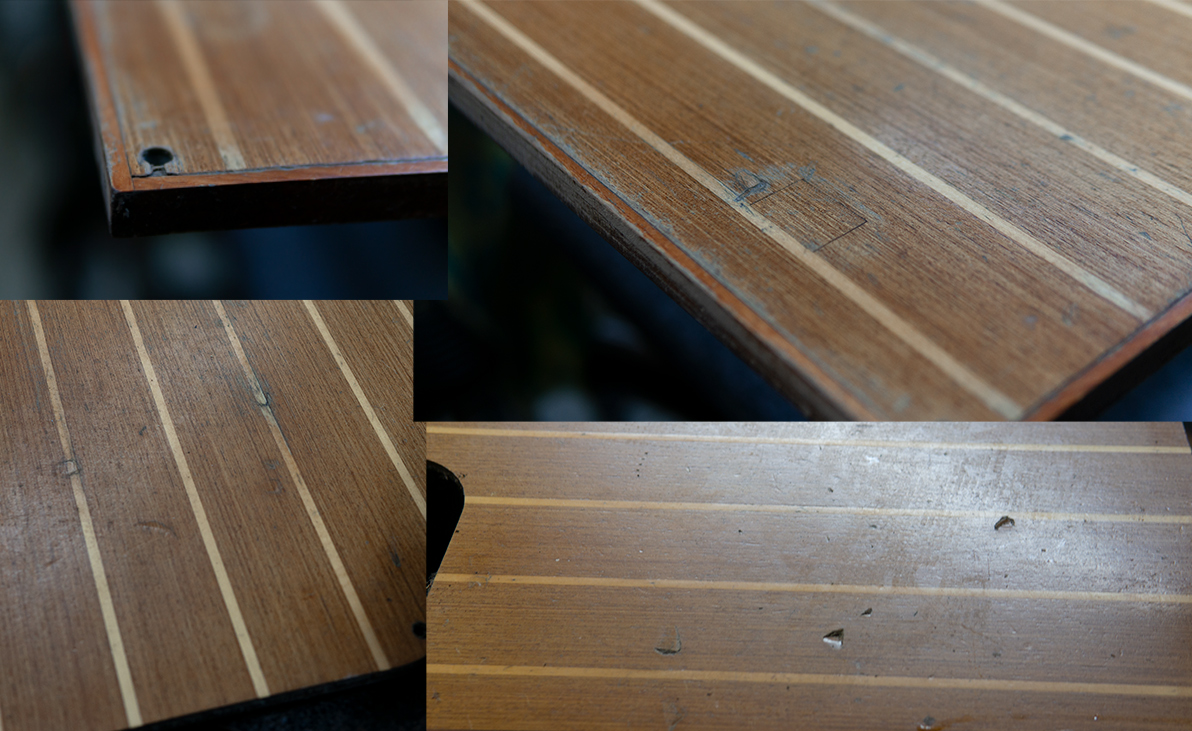 The floor was getting bad enough and I wanted to do something for several years. I pulled it up in the fall and took it home to the workshop. I started with chemical stripped, sanded lightly, repaired any de-lamination and filled all the screw holes with epoxy. Many of the screw holes had pulled into the wood or were driven to far to begin with. The teak & holly veneer is about .8mm thick so you can’t be too aggressive when sanding.